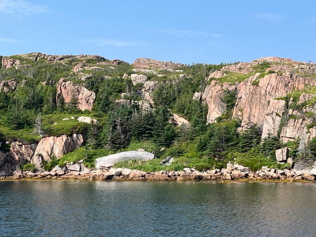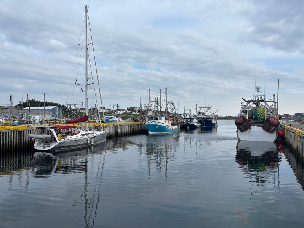 We had a lovely downwind sail to Twillingate arriving mid-day. Twillingate Bay is long, with a north-south orientation. The small, sheltered harbour is behind a substantial breakwater at the southern end. As we motored in we quickly realized that the floating docks (usually designated for transients) were full of local motorboats, so we hovered in the harbour in a cross wind, phoned the local harbourmaster (shout out to Kathy) who guided us in behind the fishing fleet to the inside of the commercial wharf where we tied off. We are getting better at maneuvering with no bowthruster! We did take time to turn Tikaani around using lines and with the help of a retired fisherman who was itching for something to do! While the fishing fleet is active here, there is no fish processing facility in town (it all gets shipped away) so the fishy harbour smell is limited when they are offloading – which was shrimp while we were there.