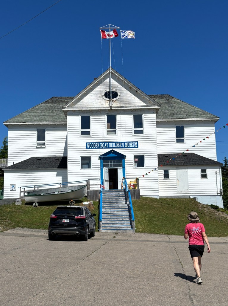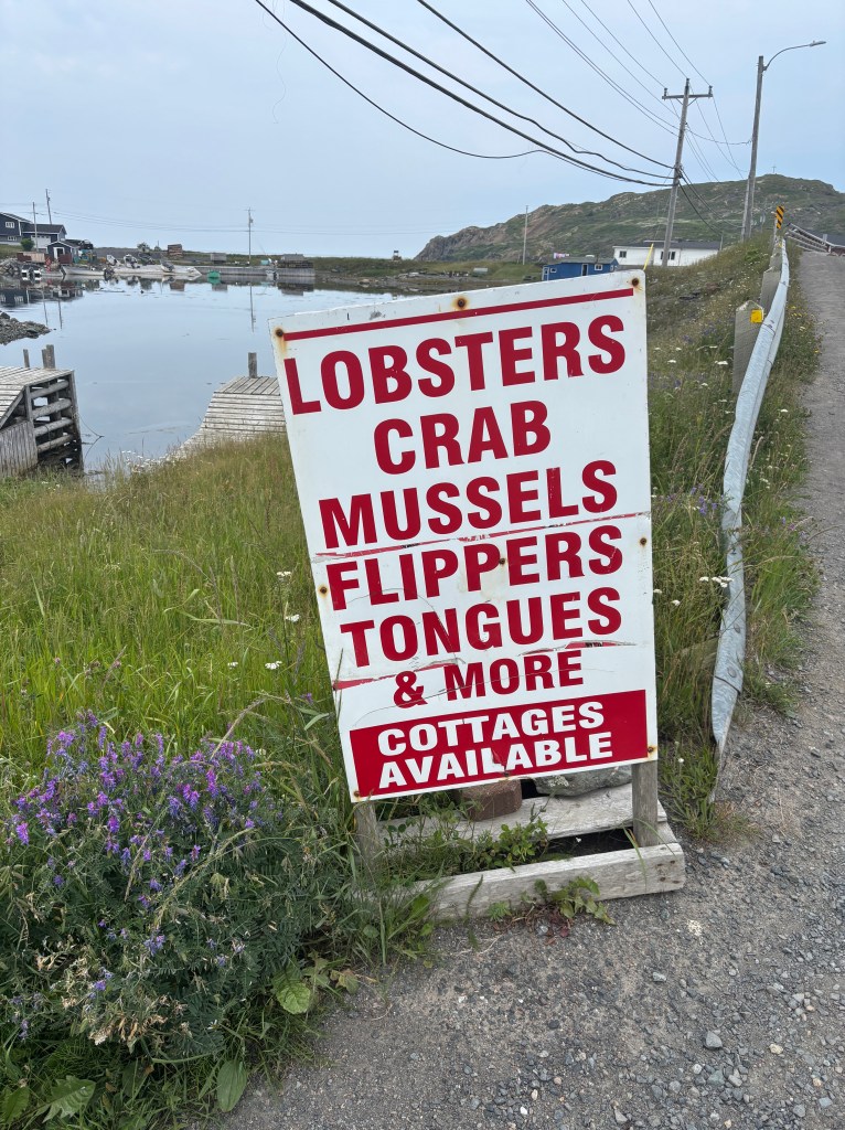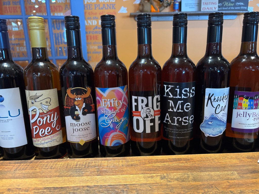 The weather was sunny and hot and Kathy suggested the Hospital Lake park and trail 15 minutes up the road. Another fresh water dunk – with the local kids! We prioritized Lobster Rolls, laundry, eating out, touristy shopping and the winery tour. Twillingate is definitely a tourist mecca – many RVs and US license plates. Breakfast at the Cozy Tea Room is someone’s walk out basement converted into a small restaurant, offering baked goods. The Great Auk Winery (Auk is an extinct penguin – puffin-like) in the adjacent town, Durrell, makes wines from local berries and Dandelion, with a good a restaurant and a funky shop. The products are decidedly Newfoundland!
