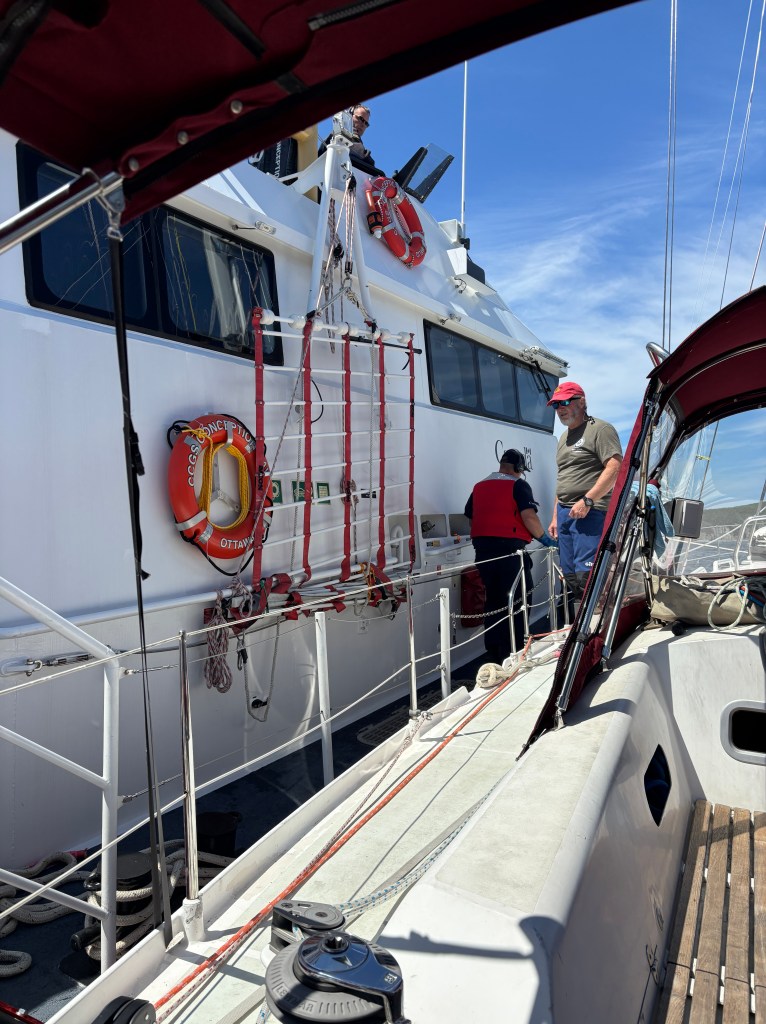 As we were motoring out of the Bay, just contemplating going through the ‘tickle’ on the exit, the engine coughed and started spewing white smoke. We shut it down immediately, Steve checked under the hood – seemed ok – but then could not get it restarted. Winds were up to 20kts and pushing us to shore quickly. We got the staysail up to give us some motion and steering, called the harbourmaster to arrange a tow back in – no response – rocks got closer, staysail was not enough, could put up the Mainsail but then still couldn’t maneuver into harbour under sail. Not knowing what else to do, we called up the coastguard (based in Labrador). Fifteen minutes later, the Coastguard Cutter Conception Bay out of Twillingate and 4 crew saddled Tikaani up (side by side) and took us back to the fishing wharf, dropped at the loading zone. Kinda like the walk of shame for sailors…