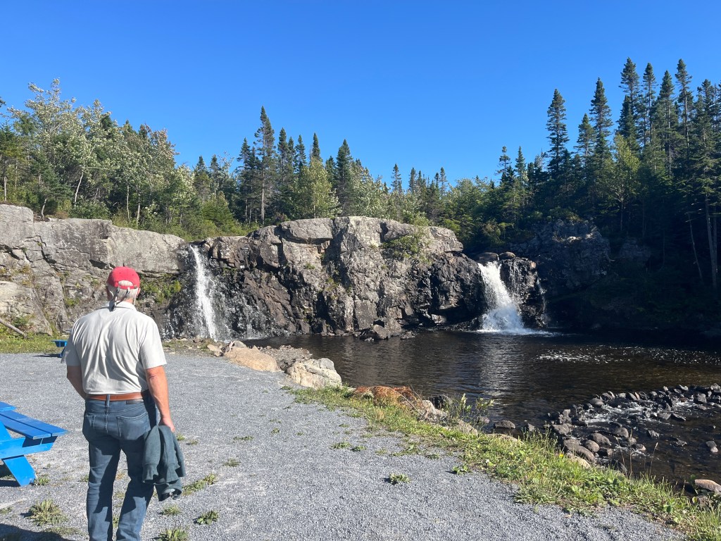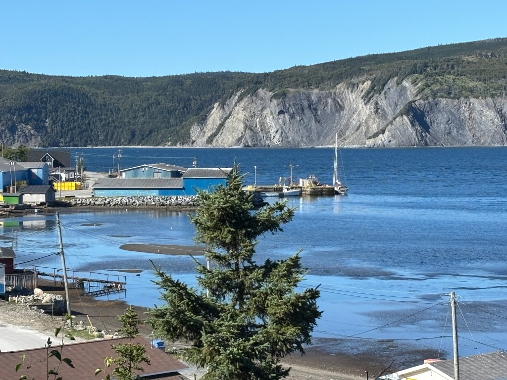 Cox Cove is north of Corner Brook in the Bay’s Middle Arm, 40 km from Corner Book at the end of the road. The dock was about 80ft at the end and was full of fishing equipment, but it was quiet and sheltered from all winds except the east, so a pretty good place to wait for Ali and the crew’s return on August 26. Walked to the Falls, had local Fish&Chips, secured boat, fenders and lines for a 6-day wharf rest.