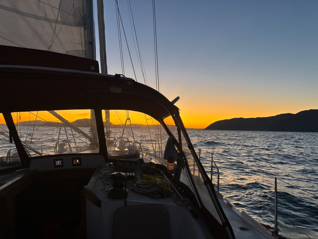 We arrived at the entrance to Bay of Islands just before nautical dawn, so with main only downwind we sailed a leisurely 4kts, waiting for sunrise. It was a perfect end to a great 22 hour sail, complete with whales! With arrival at Bay of Islands, Corner Brook, we have effectively (or a close as we are going to get this time) completed our circumnavigation of Newfoundland!