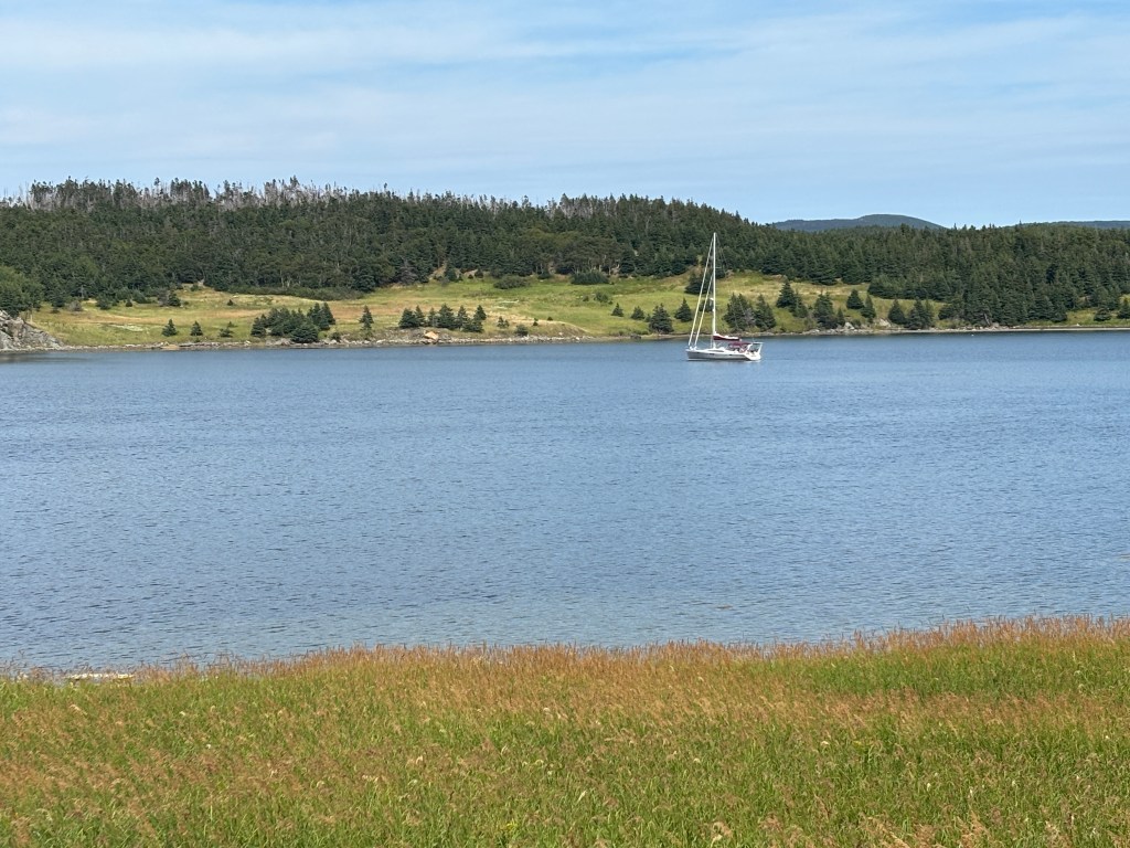 Winds shifted on our nose as we pointed East into the Bay towards Woods Island (halfway into the Bay and ~7nm, so 1 hour). Spectacular cliffs and the highest point in NL surrounded us. We motored to the very sheltered, shallow bay and put down the anchor. Our plan was to remain here for 3 nights, until the 20th, when we had a reservation at the Bay of Islands Yacht Club.