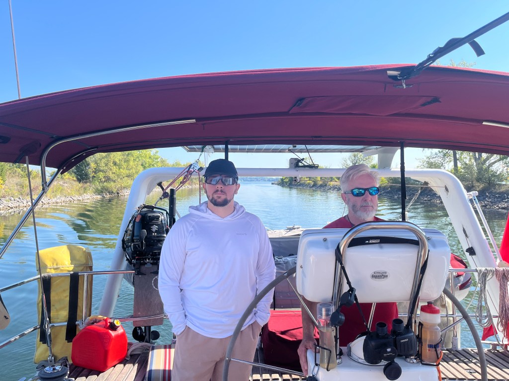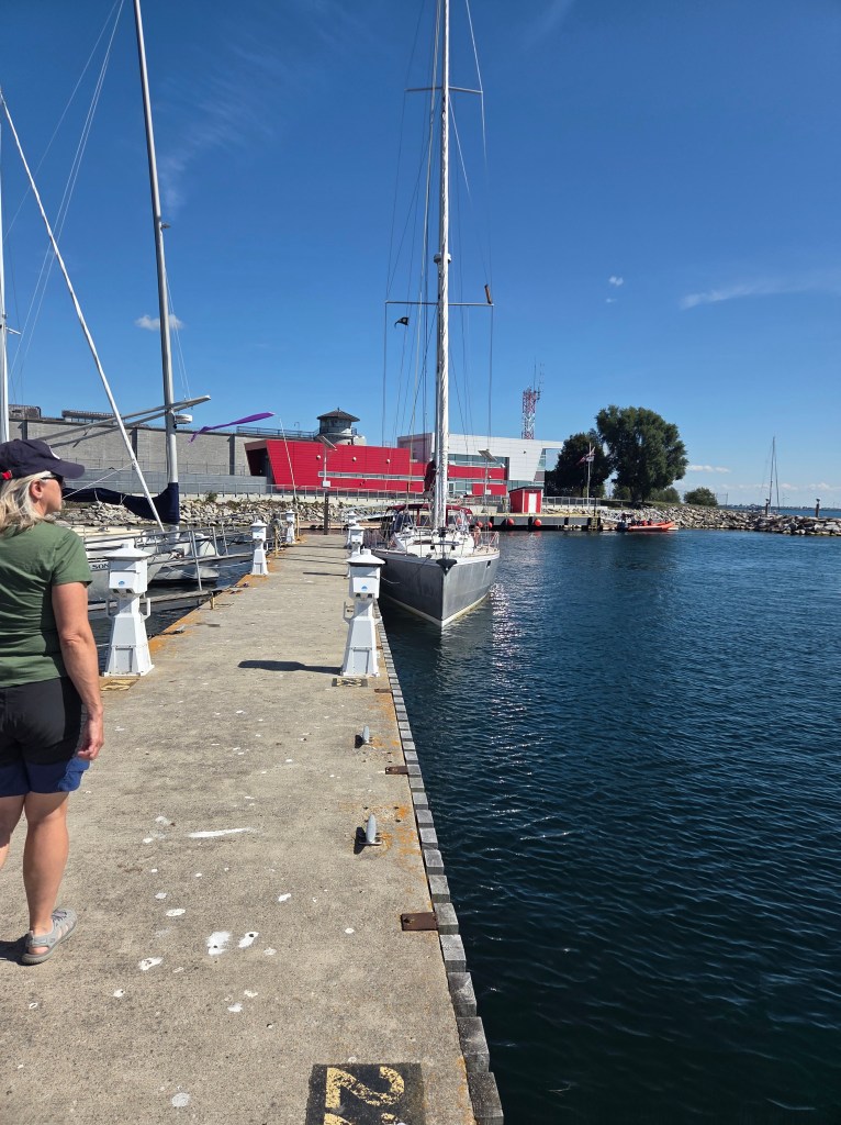 At 8am the Wheat Kings Bakery opened… and we were there! Yummy! At 9am we were at the Kingston Penitentiary for the 1.5 hr tour, with a quick visit to the Museum. What a fascinating tour of Canadian history; so well done as you get the stories from people who have worked there. James, son, was due at 2:30pm. Portsmouth Olympic Harbour was getting busy with little people and we realized that the Canadian Open Design Kingston Regatta was this weekend! This is a big deal. Lasers, 420s, 470s, Optimus – they were all launching and practicing. Oops… how to exit this harbour without a bowthruster.. only way was to go further in and circle, but this is where the launch dock is. We found a window and managed not to interfere too much with CORK – Phew!