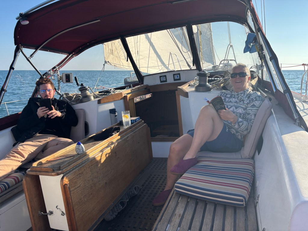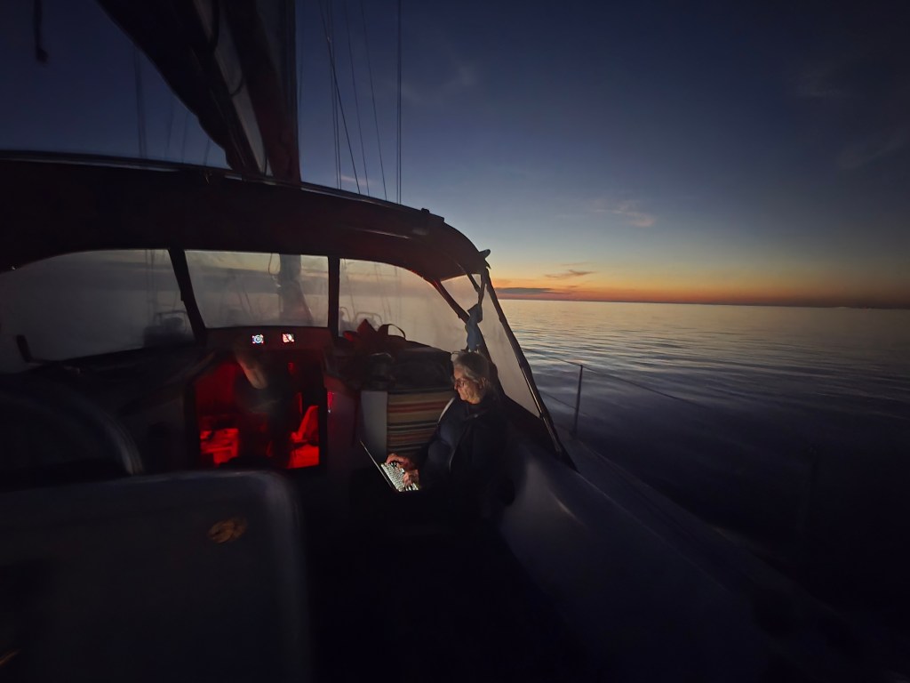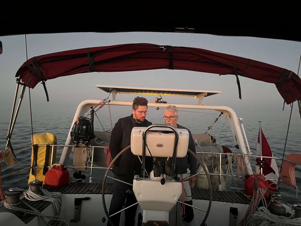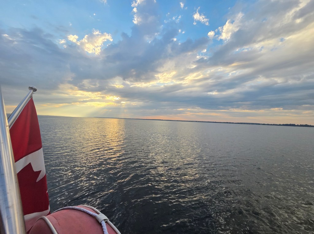 Plan A to anchor in Presquile Bay was scrapped… let’s keep going! Plan B to anchor until wind came up at 2am… scrapped. Plan C – let’s head out to the lake and take our chances… 1 model predicted wind from 2 to 7pm. We got that wind and were satisfied doing 3 to 5kts with main and genoa. Just hoped the rest of the forecast for an East wind through the night would come true – otherwise we motor. This meant we would arrive at PCYC/home on Monday afternoon. We alerted family and friends and prepared for a night on the water.