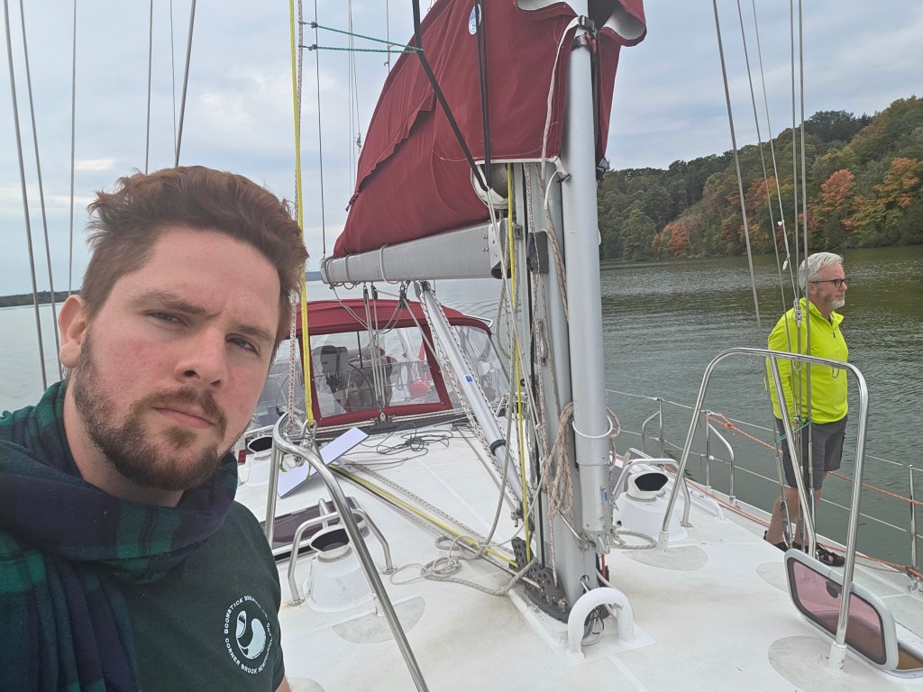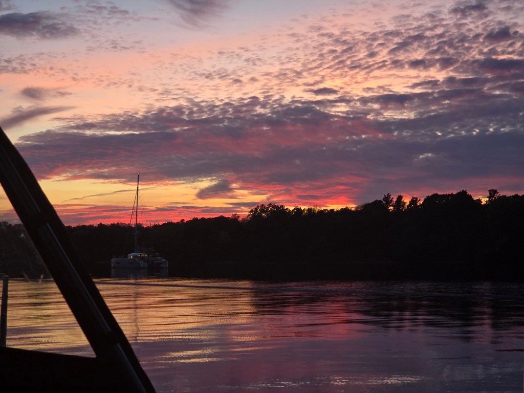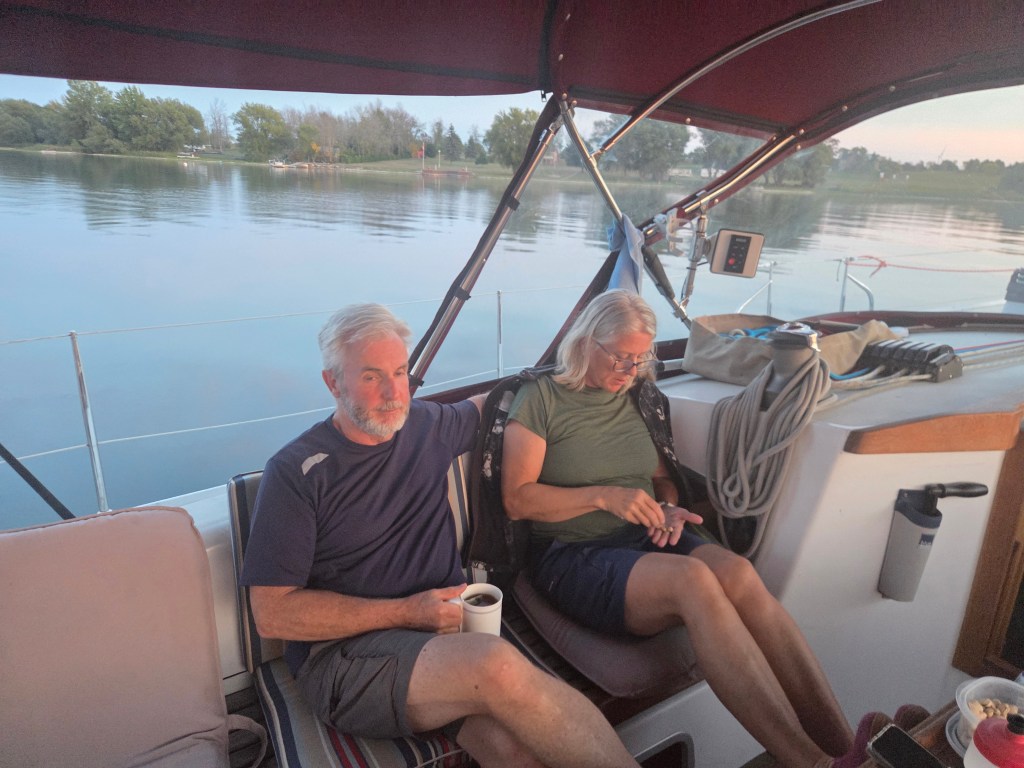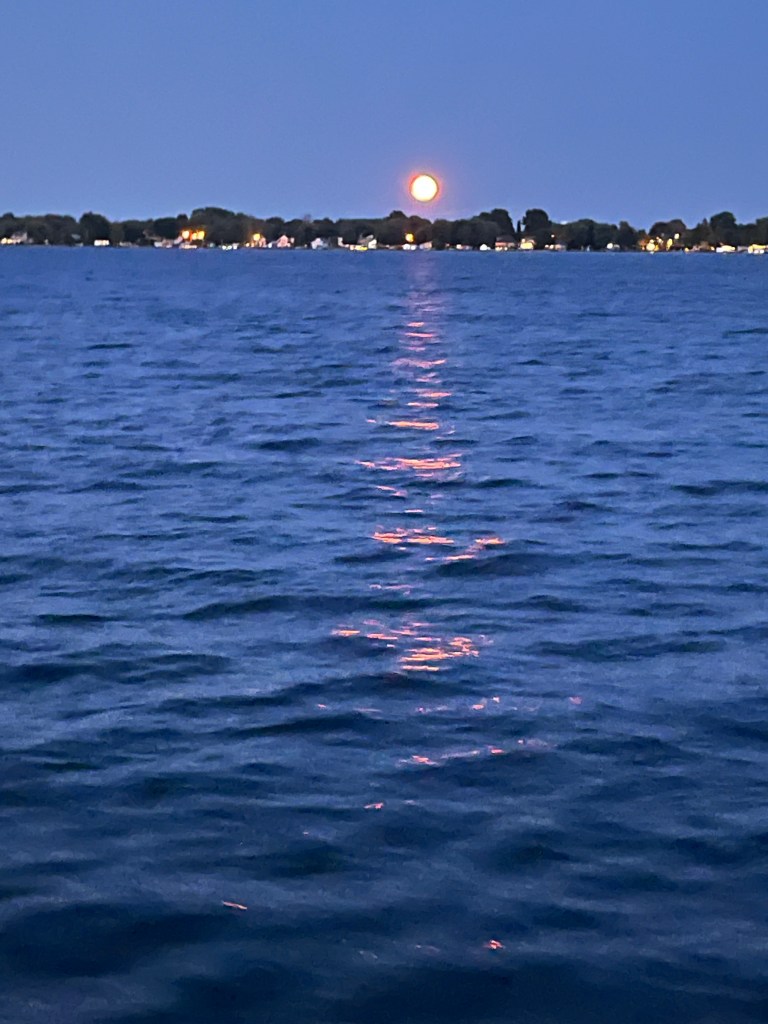 Plan A to anchor in Presquile Bay was scrapped… let’s keep going! Plan B to anchor until wind came up at 2am… scrapped. Plan C – let’s head out to the lake and take our chances… 1 model predicted wind from 2 to 7pm. We got that wind and were satisfied doing 3 to 5kts with main and genoa. Just hoped the rest of the forecast for an East wind through the night would come true – otherwise we motor. This meant we would arrive at PCYC/home on Monday afternoon. We alerted family and friends and prepared for a night on the water.