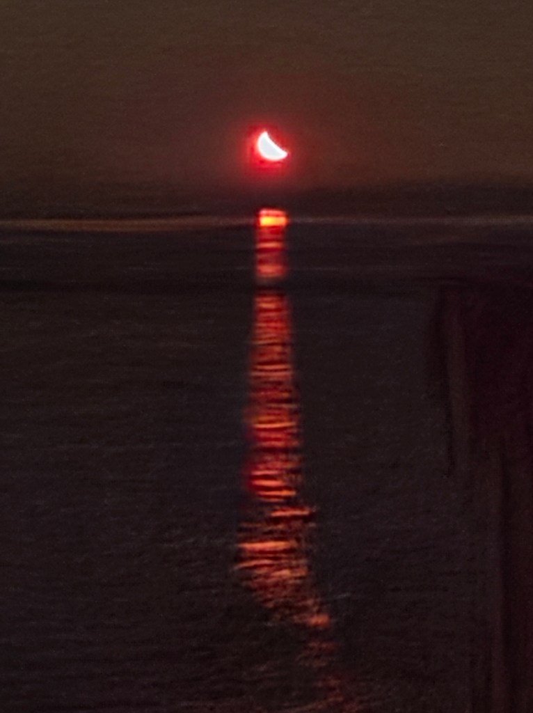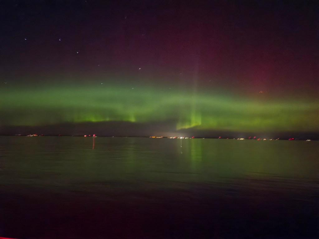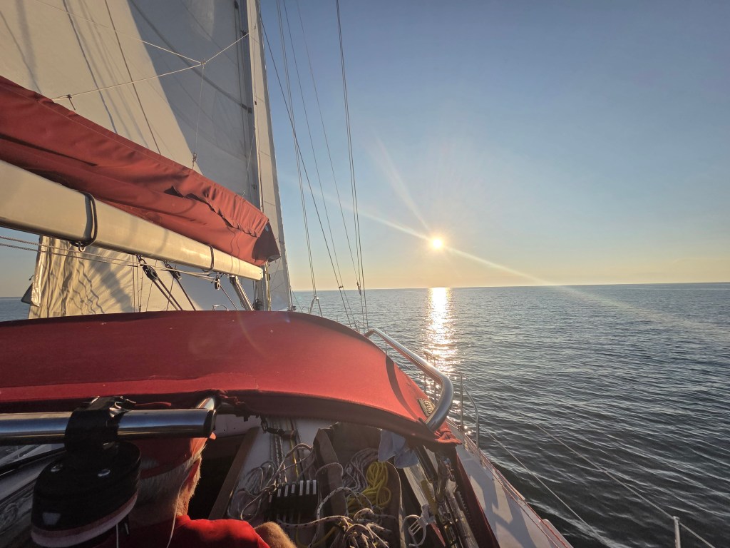 8pm to 12am – motored. 12am to 1pm downwind saiing! The northern lights were active and the stars amazing, until the ½ moon rose with an orange hew.