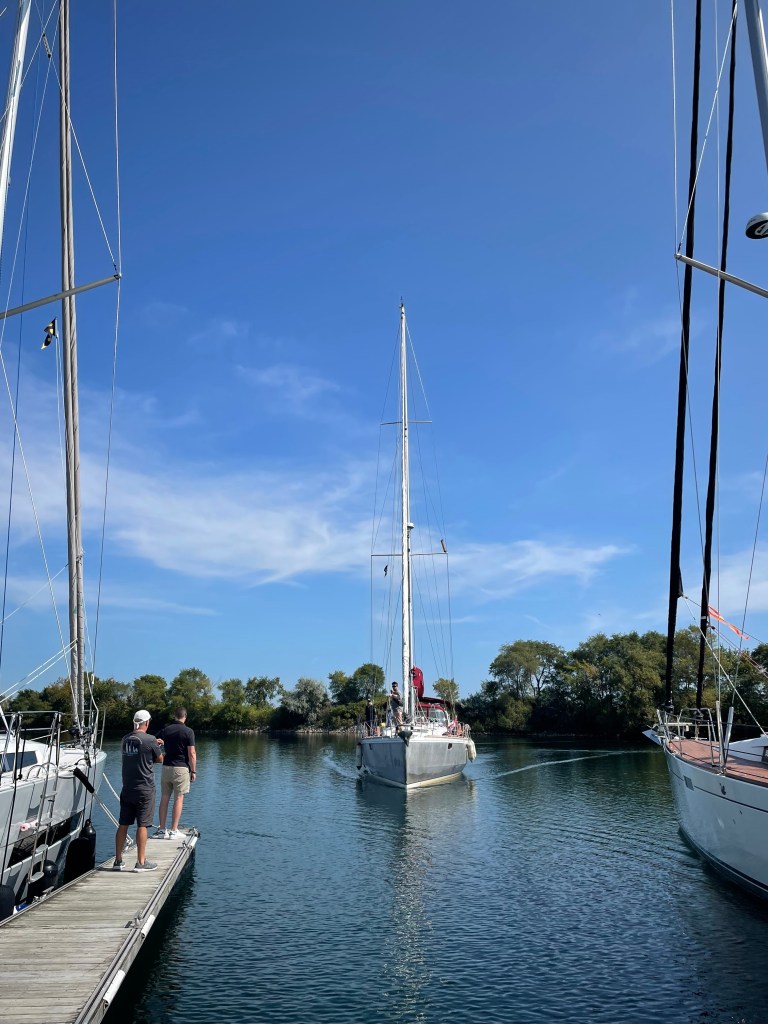 Sailing with main and Genoa at first but had to slow the boat down to ensure Grandpe could be on the dock to greet us. So, a gentle main-only downwind sail with 1 gibe saw us to Toronto.