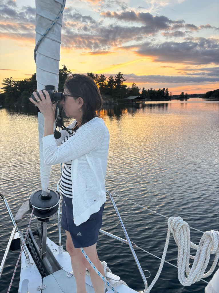 Destination today… somewhere in the Thousand Islands! Lots more boats around, passing Gananoque, we were in familiar territory, however, Mulcaster was busy and we don’t like ‘busy’… so we motored around to the next deep bay (>2m deep) and dropped anchor. It was swan central with a few motor boats driving by but all settled into a very pleasant anchorage and quiet night.